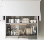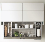 スイッチを軽く押すだけで吊戸棚の収納スペースが自動昇降