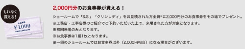 061ショールームで「S.S.」 「クリンレディ」を見積りされた方全員2000円分の御食事券をその場でプレゼント!