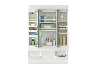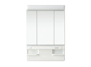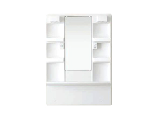 化粧品専用トレーや小物の仮置き棚、歯ブラシ立て付き。コンセントは2個設置されているので、ドライヤーや電動歯ブラシなど、2つの家電の同時使用も可能です。