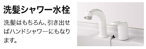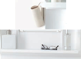 ドライヤーフックや小物の仮置き棚付き。コンセントは2個設置されているので、ドライヤーや電動歯ブラシなど、2つの家電の同時使用も可能です。